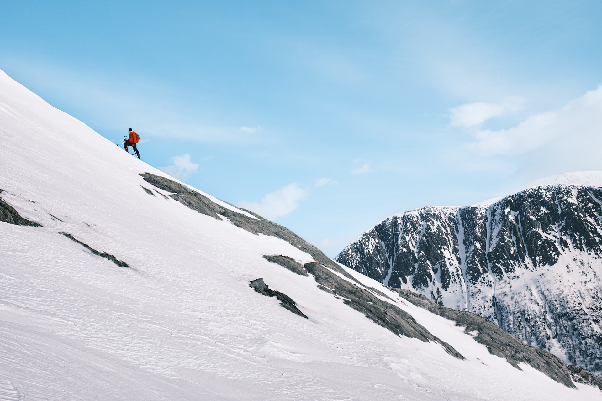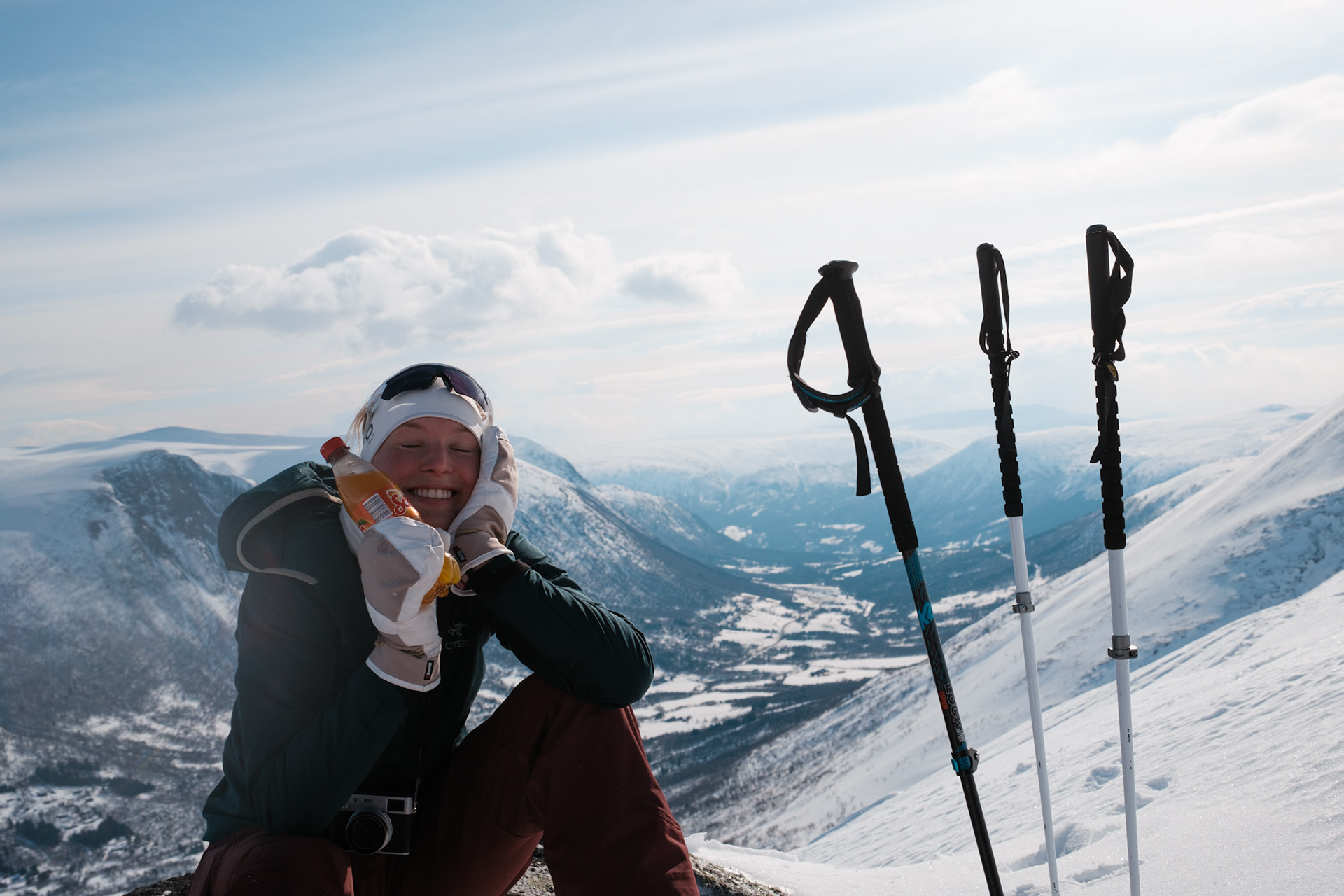 When Easter arrived, we finally escaped the apartment and headed to the mountains. Due to some issues with Kristian's backcountry skis, we ended up in Oppdal, where Kristian could rent gear for two days. With equipment for just one and a half days, we aimed for a longer adventure on the first day. Starting from Gjevilvassdalen, we climbed Nonshøa (1,532 meters above sea level) and Kråkvasstinden (1,700 meters). The route totaled 30 km with an elevation gain of 1,691 meters. We were blessed with perfect weather from midday until sunset as we returned from Kråkvasstinden.